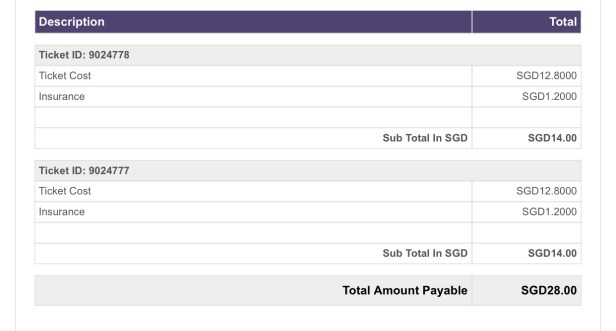 I purchased our bus tickets through the website and paid via card. The bus ticket cost for a one way trip (Singapore-Kuala Lumpur) is 14SGD per person (under the bus operator called Billion Stars). Here is a copy of my online transaction for reference:
